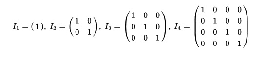 Die Einheitsmatrix ist eine Matrix mit speziellen Eigenschaften und besteht nur aus 1 und 0 Elementen. Für die Vektorräume der Dimensionen 1-4 sehen sie so aus: